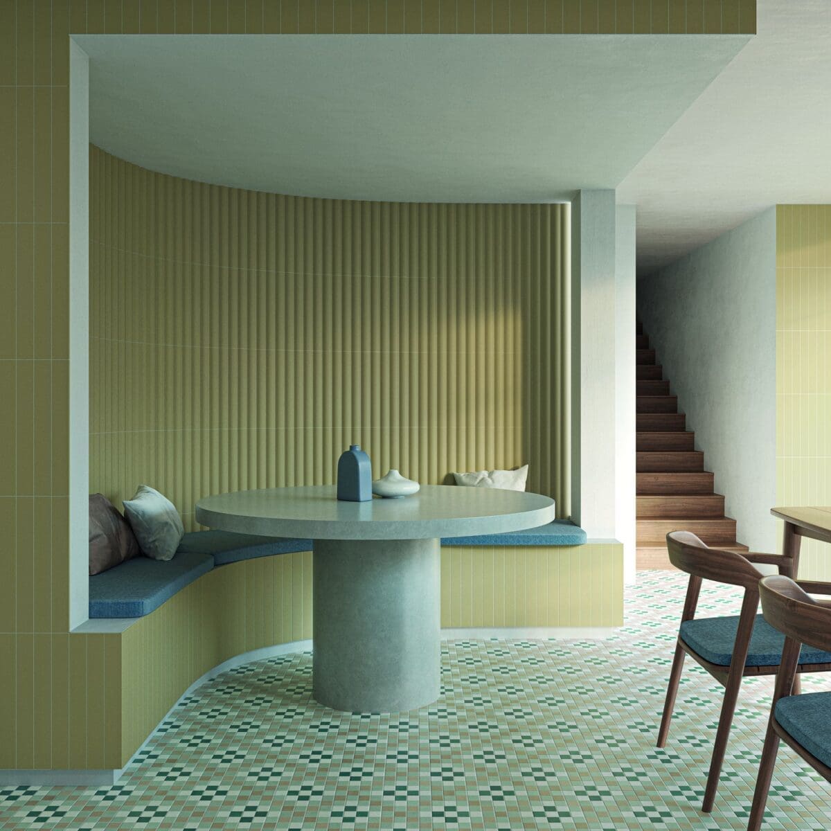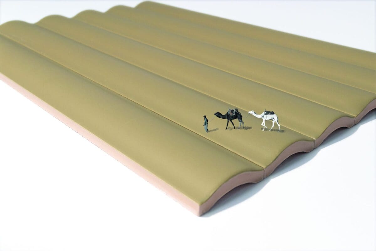 Faces Dune Vegan Tile - Reshaping the boundaries of ceramic decoration. Like the surfaces of the Earth, we present our Coast, Dune, Valley and Hill in ceramic tiles, staying true to our roots. Harmony between colour and form. Vertical surfaces with unconventional shapes which capture who we are amd our heritage.