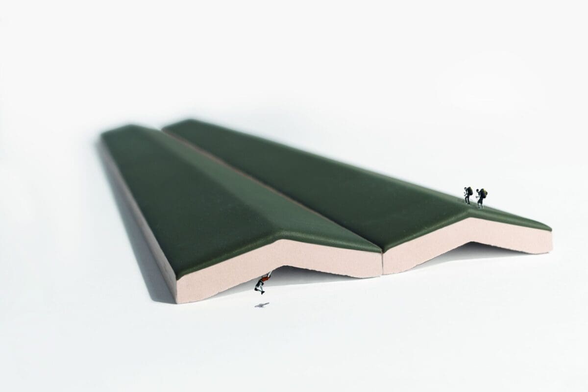 Faces Hill Pine Tile - Reshaping the boundaries of ceramic decoration. Like the surfaces of the Earth, we present our Coast, Dune, Valley and Hill in ceramic tiles, staying true to our roots. Harmony between colour and form. Vertical surfaces with unconventional shapes which capture who we are amd our heritage.