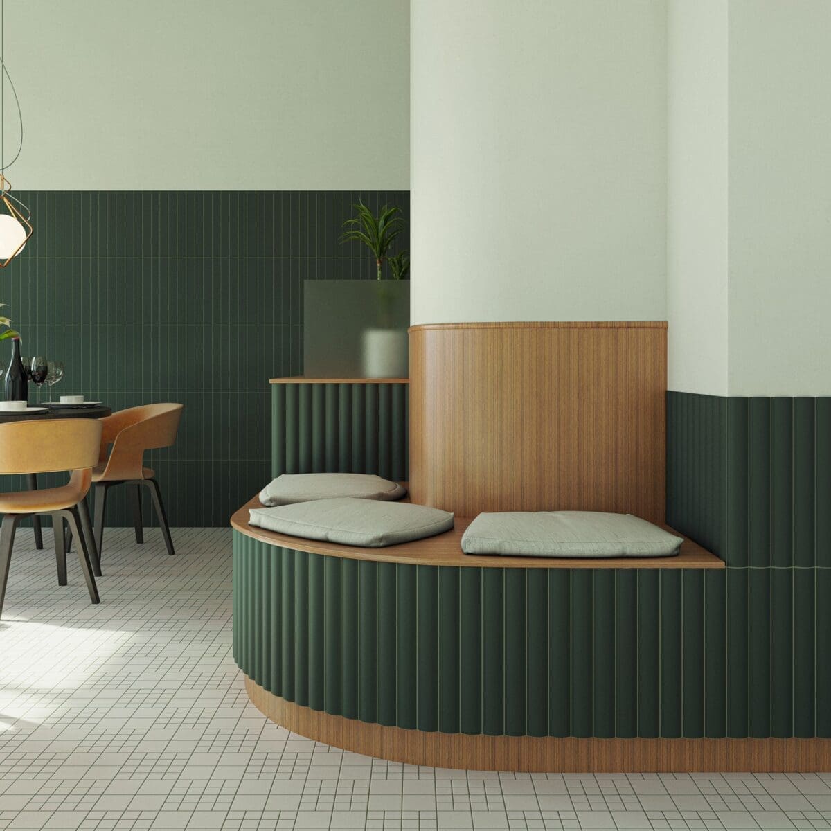 Faces Liso Pine Tile - Reshaping the boundaries of ceramic decoration. Like the surfaces of the Earth, we present our Coast, Dune, Valley and Hill in ceramic tiles, staying true to our roots. Harmony between colour and form. Vertical surfaces with unconventional shapes which capture who we are amd our heritage.