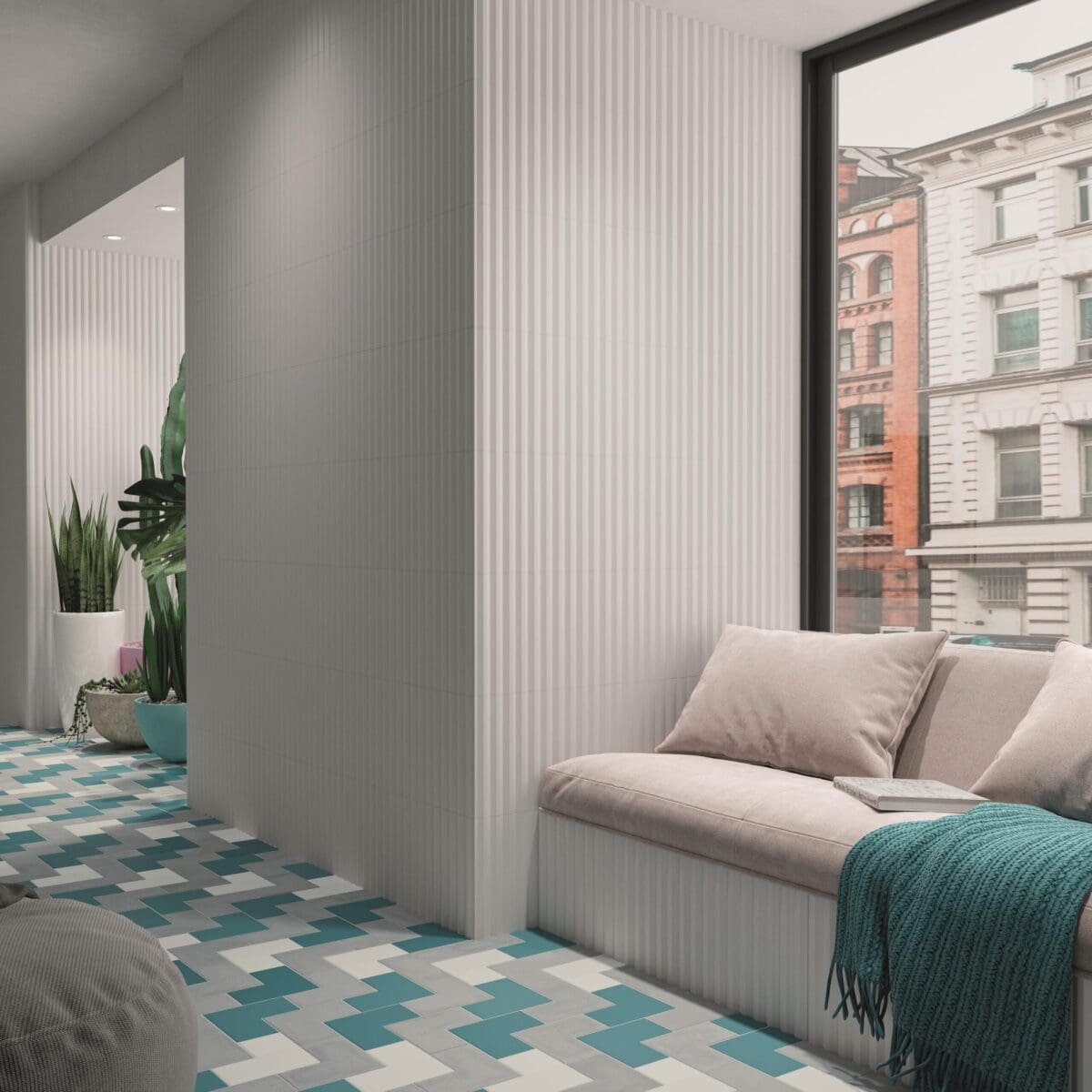 Stripes Ice White Transition Tile - Perfect transition from dimension to flat surfaces. Stripes can be laid vertical or horizontally to your choice, allowing walls striped with bands of light and shadow to create different dimensions with a space.